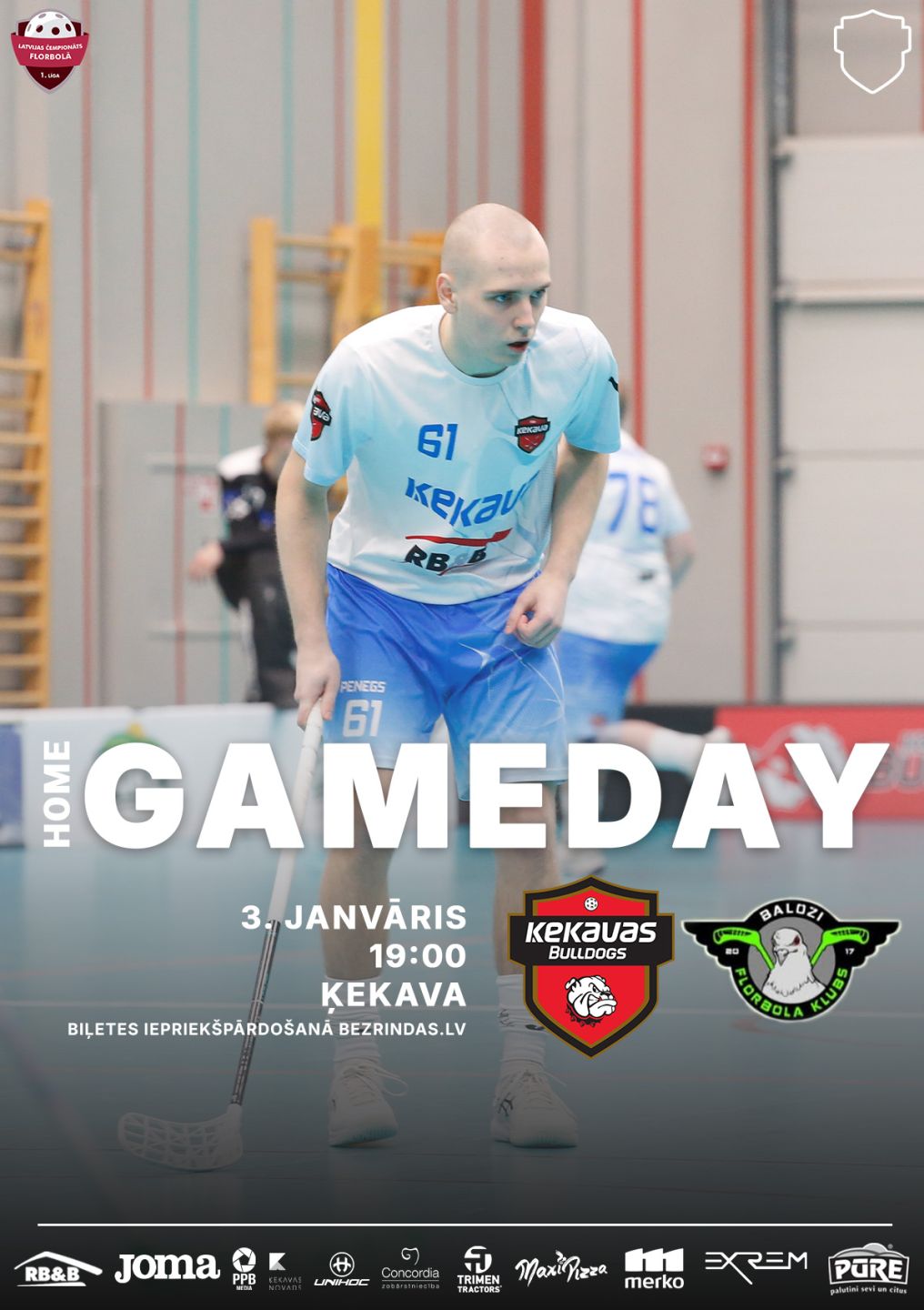 Ķekavas Bulldogs jaunās 2025/2026 vīriešu 1.līgas sezonas mājas spēle! Skolēniem un pensionāriem, uzrādot apliecību - 1.00 € + komisijas maksa. Bērniem vecumā līdz 7 gadiem un invalīdiem uzrādot apliecību - ieeja bez maksas. Pasākuma biļete ir derīga ieejai tikai vienu reizi. Ierobežotā skaitā biļetes iespējams iegādāties tikai www.bezrindas.lv. Pasākuma norises vietā biļetes tirgotas netiks. Ķekavas Bulldogs sezonas abonements 2025/2026 Vēl joprojām saglabājas ELVI vīriešu līgas sezonā izmaiņas noteikumos, kuri jāievēro spēļu apmeklētājiem - sporta zālēs uz spēlēm netiek ienestas un spēļu laikā netiek izmantotas taurītes un sirēnas, kā arī netiek ienesti dzērieni stikla traukos. Tāpēc aicinām līdzi nest tikai bungas, citus atbalstīšanas elementus, protams - arī jūsu skaļās balsis! Tiekamies spēlēs! |