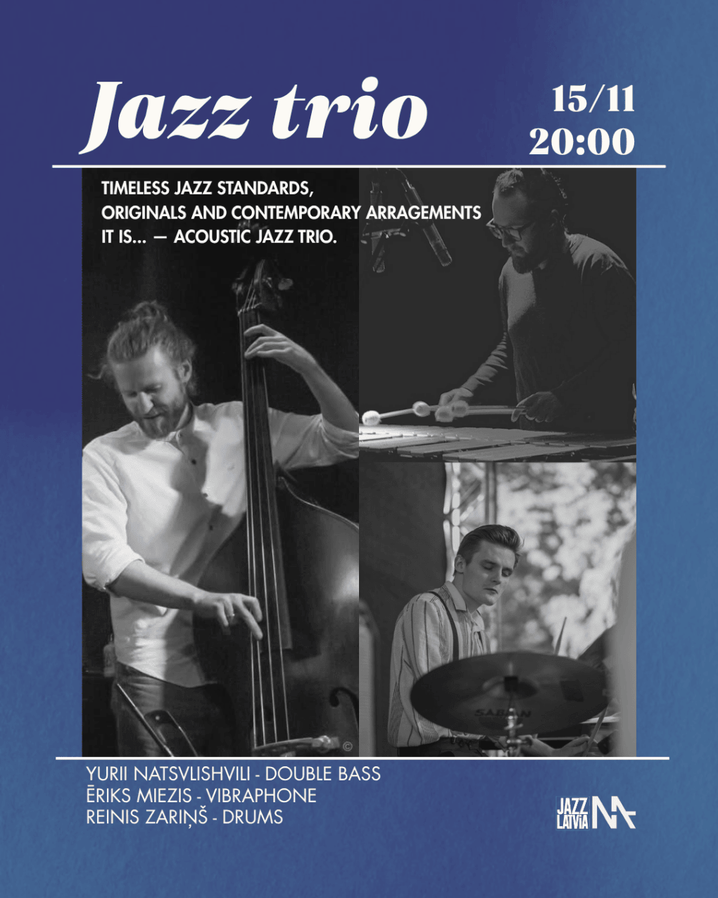 An international acoustic jazz trio: Yurii Natsvlishvili (Ukraine, double bass), Ēriks Miezis (Latvia, vibraphone), and Reinis Zariņš (Latvia, drums) will take the MASA stage for an evening of timeless jazz standards and contemporary arrangements.