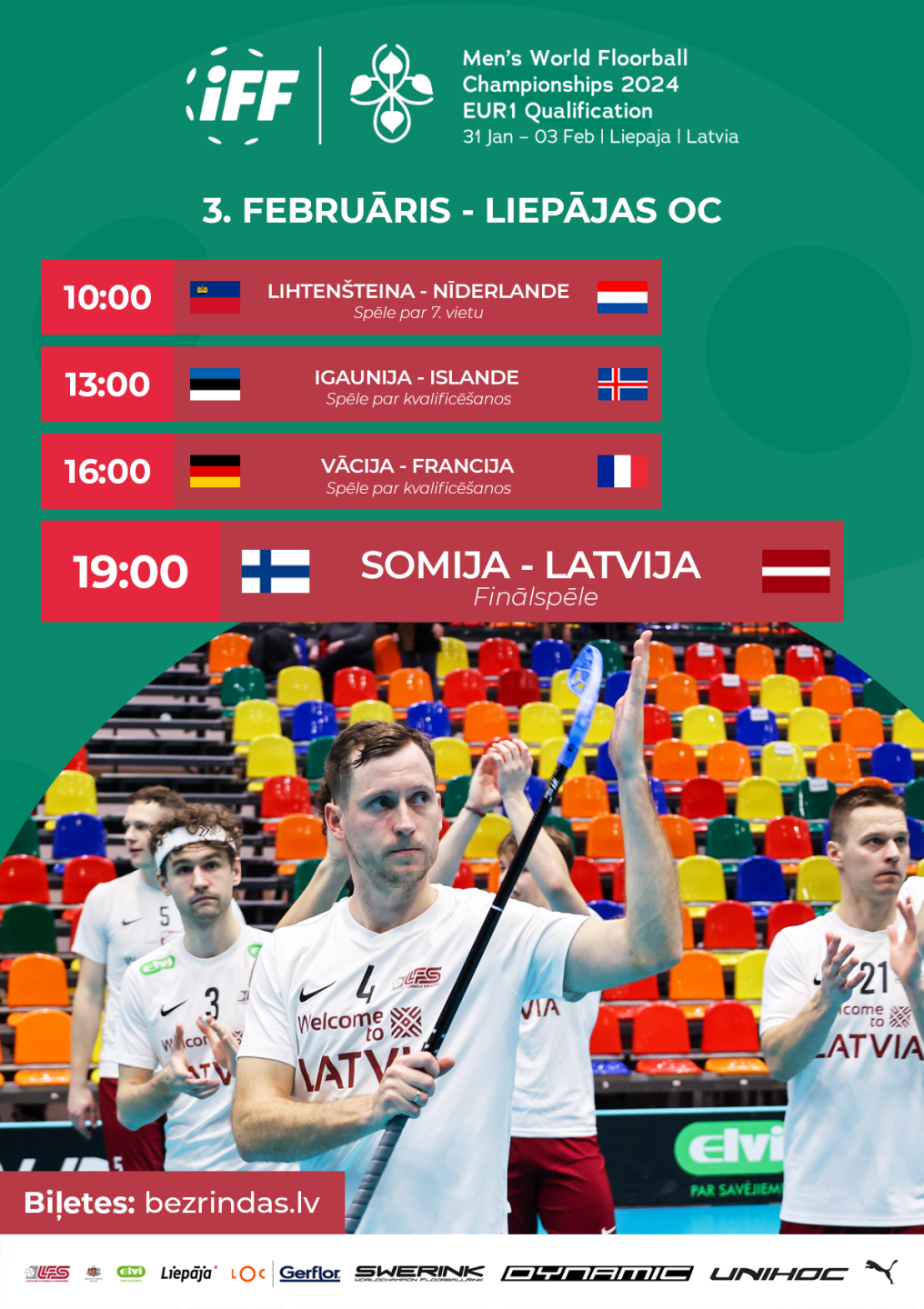 Men's World Floorball Championships 2024 Qualification Tournament will take place at the Liepāja Olympic Center from January 31 to February 3. Eight national teams will play for four tickets to the final tournament in Malmö, Sweden.