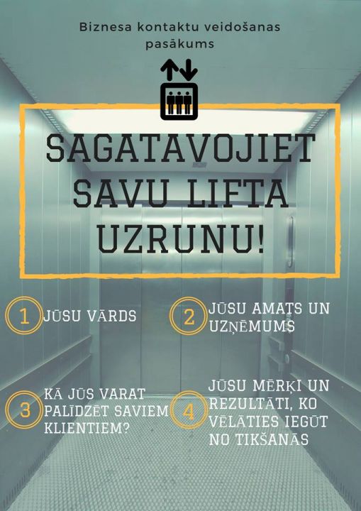 - Sagatavot lifta uzrunu jeb elevator pitch (īss kopsavilkums par sevi)