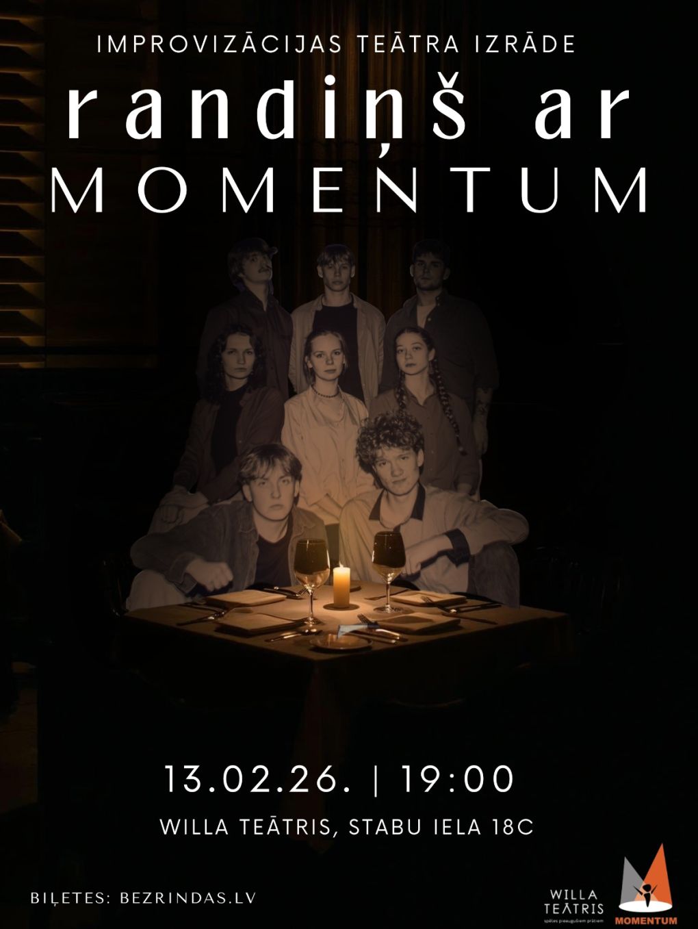 Improvizācijas teātris "Momentum" aicina skatītājus tikties vakarā pirms Valentīndienas uz smieklu un mīlestības pilnu piedzīvojumu! Tiks atkausētas pat saltākās ziemas sirdis ar kārtīgu humora devu un siltu kopā būšanas sajūtu... Bez skatītājiem improvizācijas teātrī neiztikt, tāpēc visi aicināti līdzi ņemt otrās pusītes, ģimeni un draugus uz brīnišķīgu improvizācijas "randez-vous"!