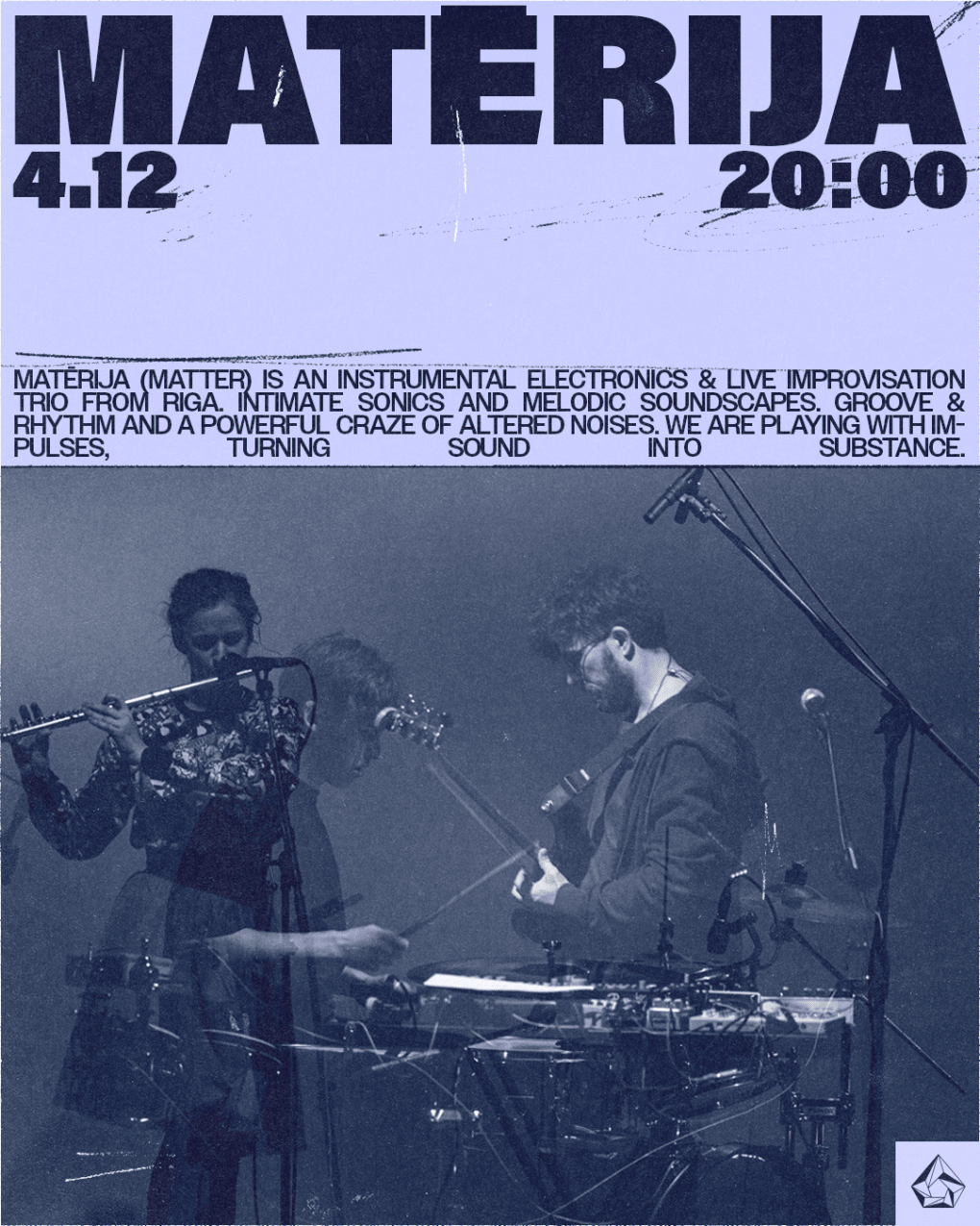 Matērija (Matter) is an instrumental electronics & live improvisation trio from Riga. Intimate sonics and melodic soundscapes. Groove & rhythm and a powerful craze of altered noises. We are playing with impulses, turning sound into substance.