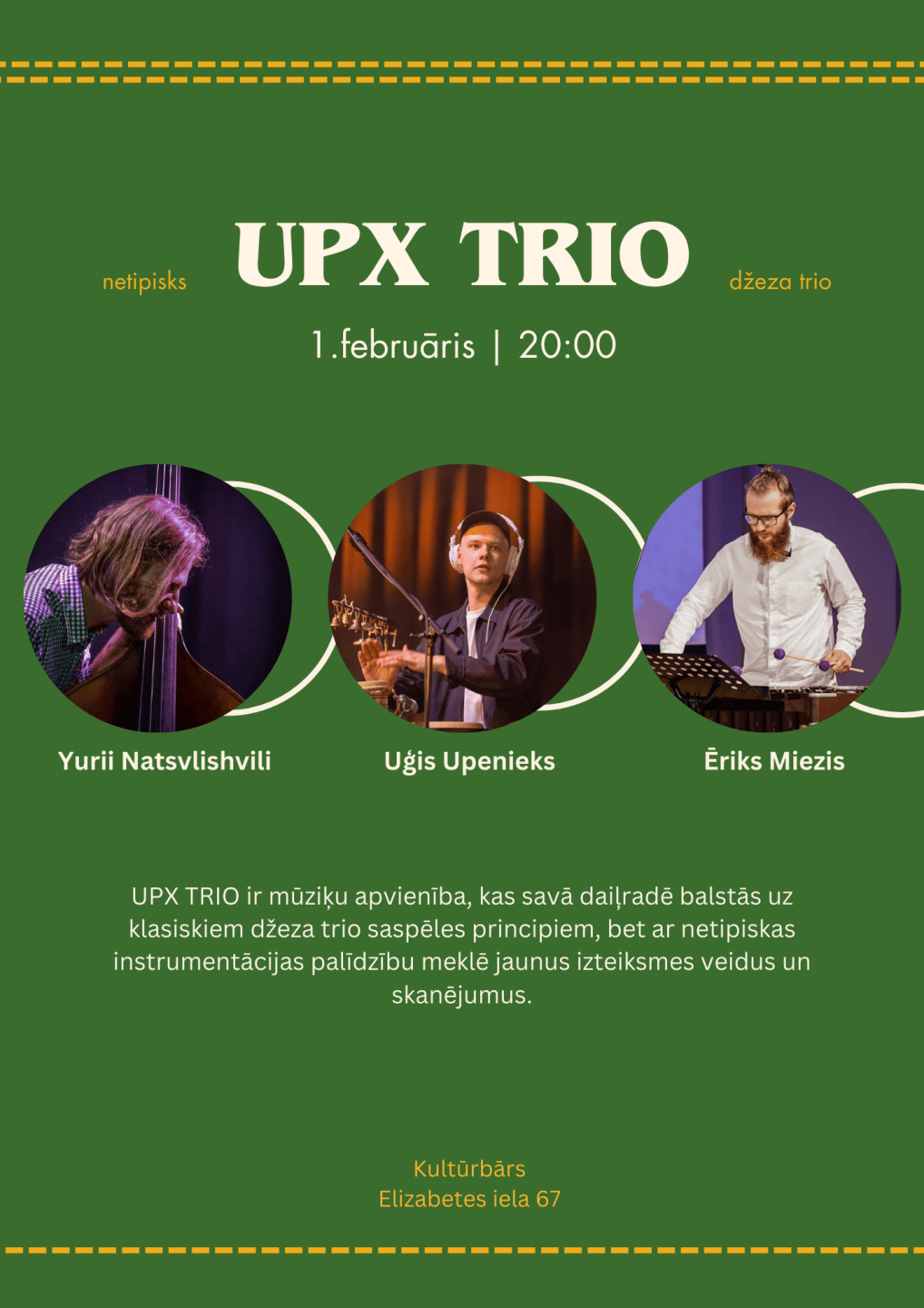 UPX TRIO ir spontāni izveidojusies mūziķu apvienība, kas savā daiļradē balstās uz klasiskiem džeza trio saspēles principiem, bet ar netipiskas instrumentācijas palīdzību meklē jaunus izteiksmes veidus. Ierastā bungu komplekta vietā dzirdēsiet īpaši pielāgotu sitaminstrumentu izkārtojumu, savukārt ģitāras un klavieru vietā skanēs vibrafons. Tembrālo krāsu paleti kopā sasaistīs kontrabasa zemās frekvences.