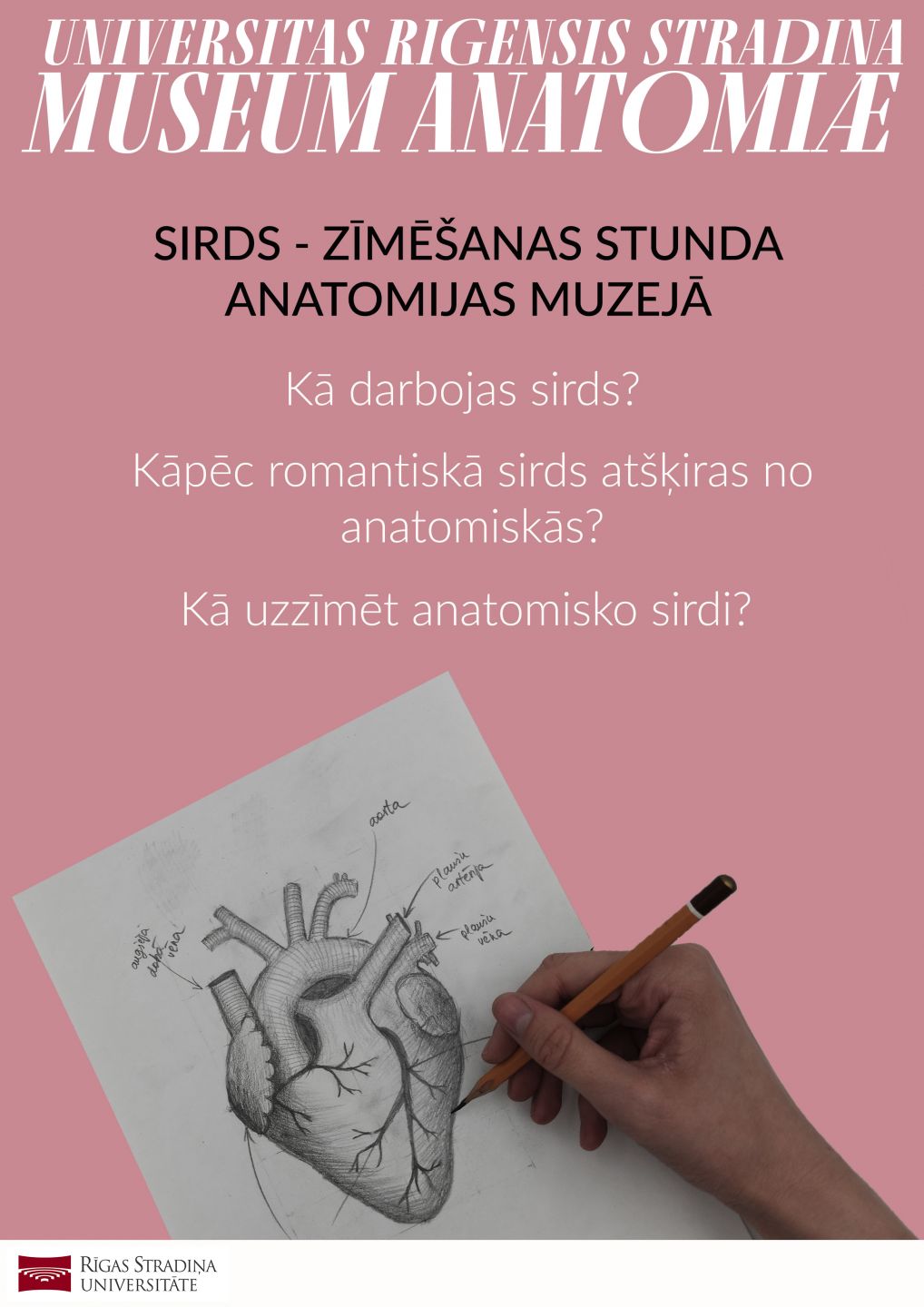 Zīmēšanas stundā Anatomijas muzejā uzzināsiet, kāpēc anatomiskā sirds atšķiras no romantiskās, kāda ir šī cilvēka ķermeņa motora uzbūve un kā tas darbojas. Nodarbības otrajā daļā soli pa solim iemācīsimies uzzīmēt anatomiski precīzu sirdi.