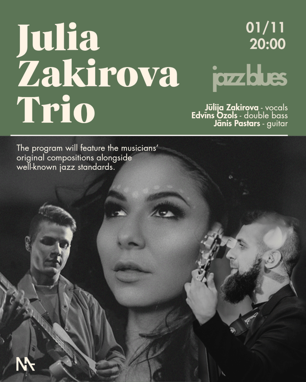1 ноября в MASA Kultūrbārs пройдет вечер джаза с трио Юлии Закировой. В программе — авторские композиции музыкантов и мировые джазовые стандарты.
