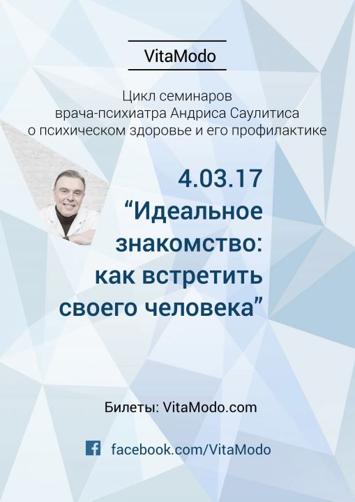 Андрис Саулитис, клинический психиатр с обширным международным опытом, в рамках проекта VitaModo проводит серию семинаров о психическом здоровье и его профилактике. «Моя установка проста: я все делаю для себя, - говорит доктор Саулитис. - Этот проект создан, чтобы родственным душам, как я, помочь достичь осознания и продвинуться дальше, чтобы страдания людей не пропали зря, а шли на пользу, чтобы люди больше понимали, любили, сопереживали».